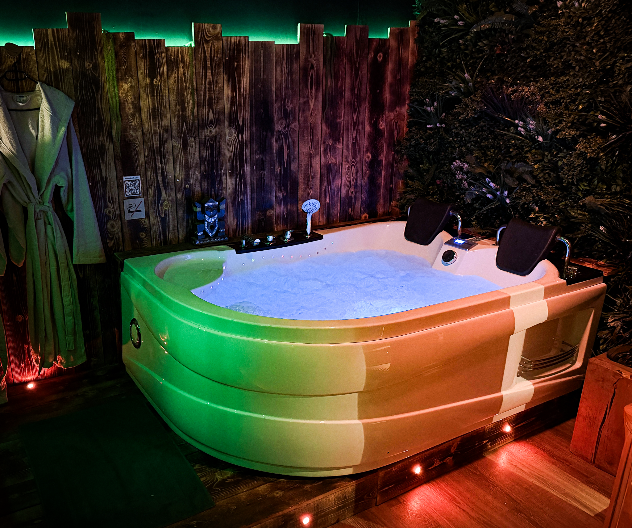 Profitez d’une baignoire balnéo privatif avec jets massants et éclairage LED multicolore, d’un sauna Infrarouge, et d’une décoration soignée inspirée de la culture polynésienne.